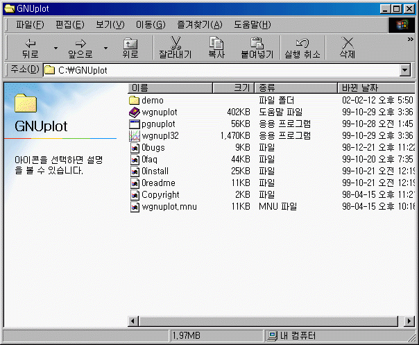 : GNUplot은 위의 그림과 같이 몇 개 않되는 화일로 구성되어 있습니다. demo 폴더에는 임의의 예제 파일이 들어 있으므로 제외하면 더 작겠죠? ^^; 그림에서 보는 바와 같이 그 크기는 demo 파일 포함 1.97MB로 되어 매우 작습니다. 하지만 위에서 재시한 고가의 프로그램과 견주어 그 성능이 뒤지지 않는다고 저는 생각합니다. 물론 위에서 제시한 고가의 프로그램에 비해서 떨어지는 기능들이 있기는 하지만 초보자들이 쉽게 무난하게 사용할 수 있는 프로그램이라 하겠습니다. 그럼 지금부터 GNUplot에 대한 간단한 설명과 예시를 들어서 쉽게 사용하실 수 있도록 하겠습니다.